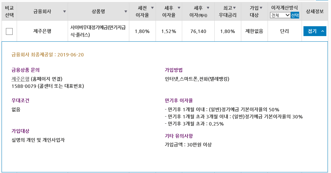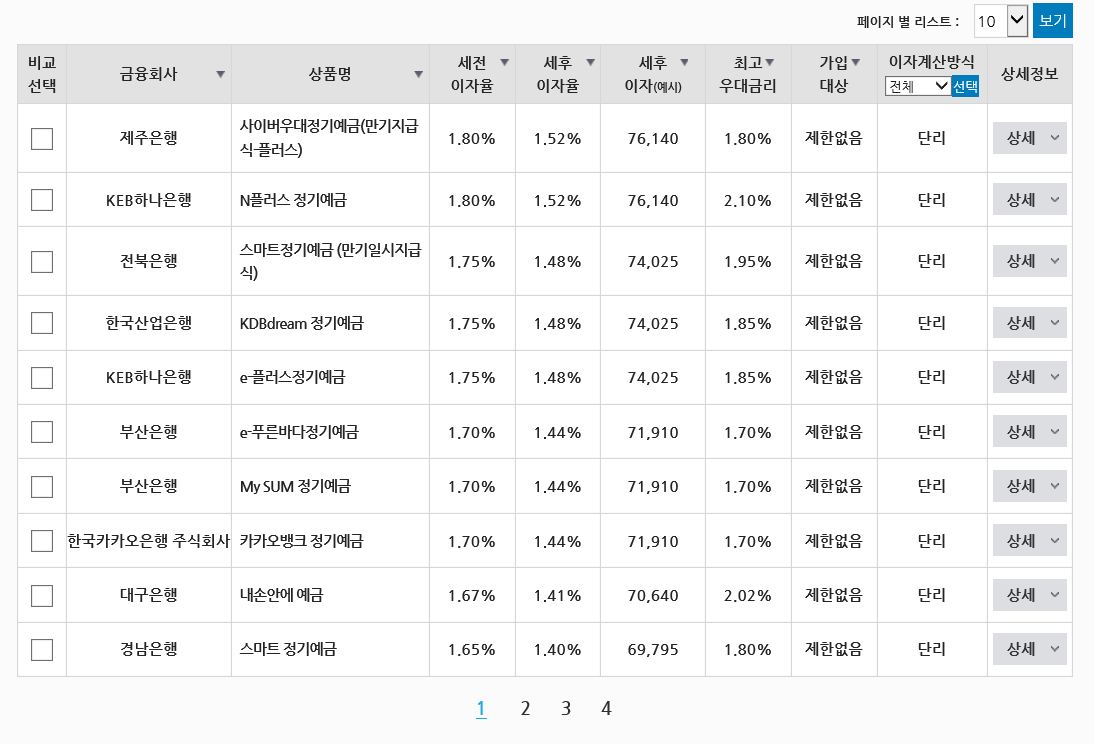 검색된 금융상품에 대해서 세전 이자율, 세후 이자율, 세후이자, 최고우대금리, 가입대상, 이자계산방식까지 확인이 가능합니다.