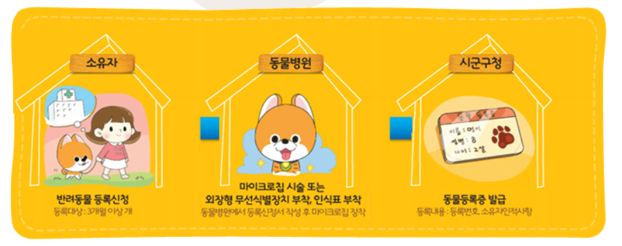 반려동물을 읽어버릴 때 동물보호 관리시스템을 통해 소유자를 쉽게 찾을 수 있는 목적으로 의무화 반려동물 등록제를 시행합니다.